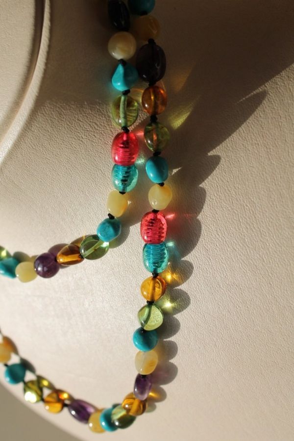 Renk : Green kehribar & Milky kehribar & Honey kehribar + Mor Ametist + Mavi Turkuaz Kombin Taşlarla Kolye