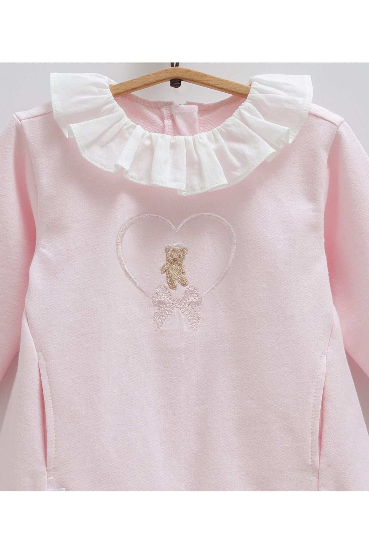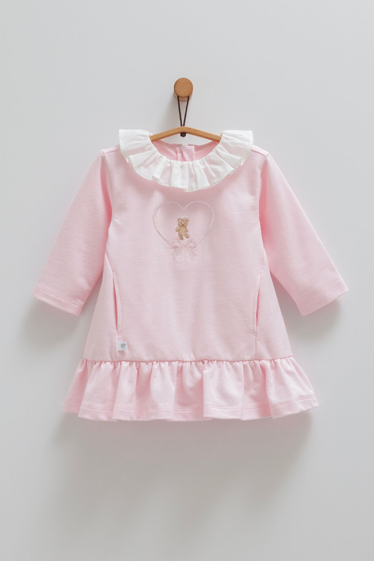 Beyaz fırfırlı yaka ve sevimli ayıcık nakışı, bu elbiseye şirin bir hava katıyor.