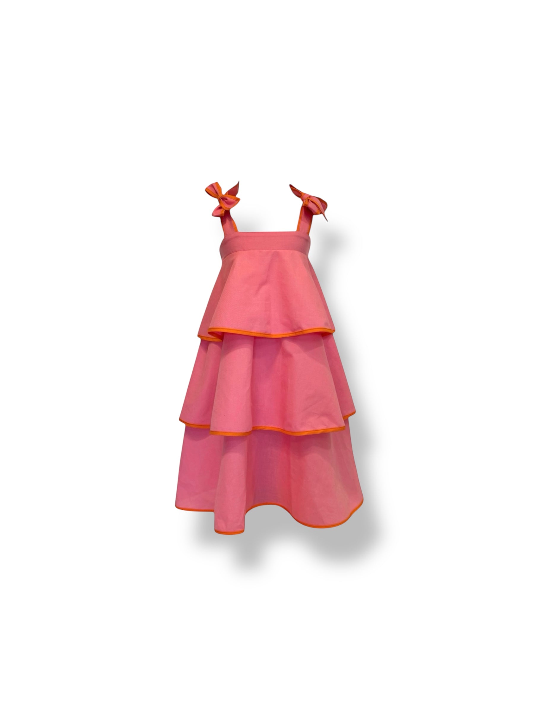 Renkli yaz günlerine eşlik edecek bu üç kat volanlı elbise, enerjik tasarımı ve konforlu yapısıyla minikler için tasarlandı.