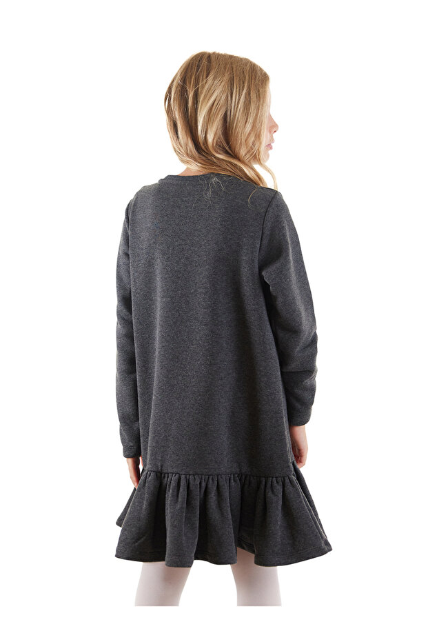 Üzeri altın rengi sim, tavşan baskılı kız çocuk elbise.