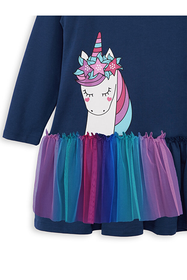 Orta kalın %100 pamuklu kumaştan kız çocuk lacivert elbise.