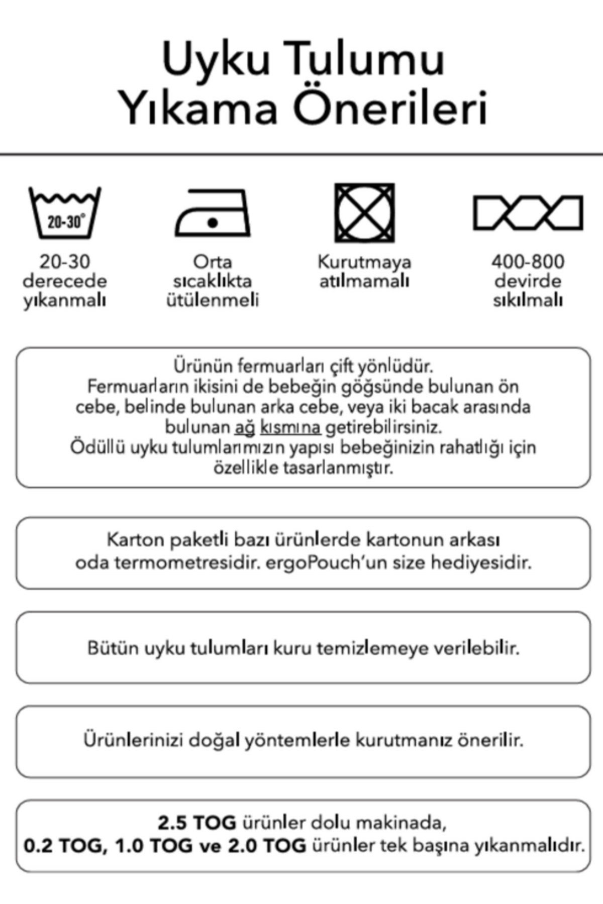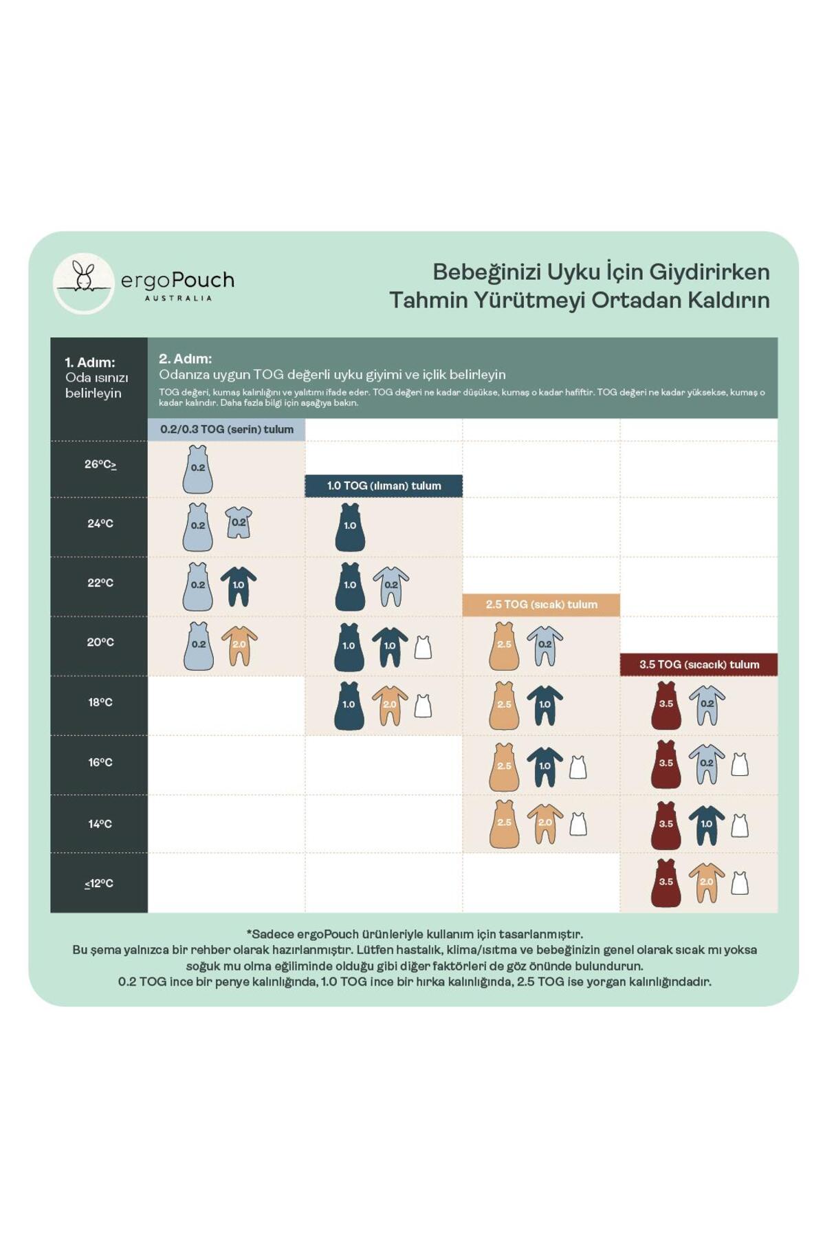 1.0 TOG Organik Pamuklu Pijama Tulumlarımızı bahar aylarında, 22 – 24°C arası oda sıcaklıklarında, içerisine ince bir badi ile rahatlıkla kullanabilirsiniz.