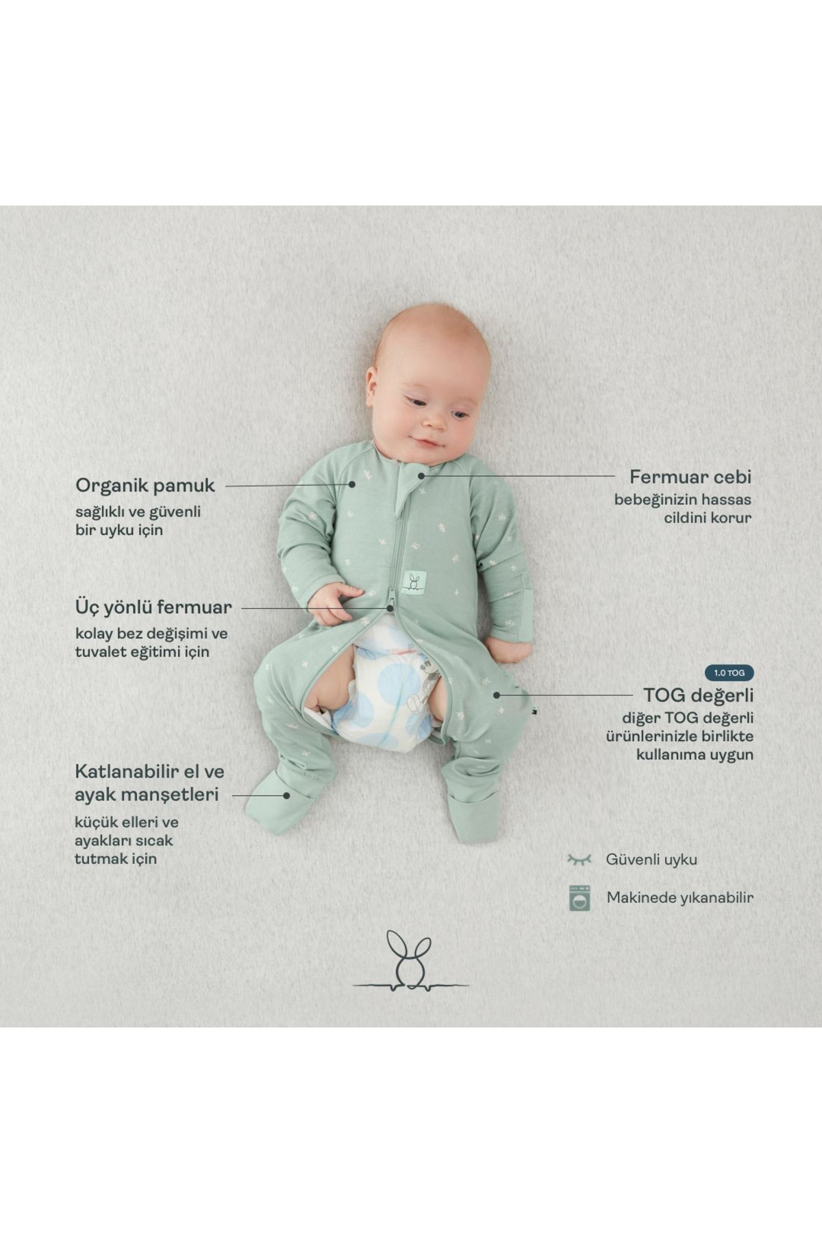 Fermuar cebi ile bebeğinizin hassas cildini korur.