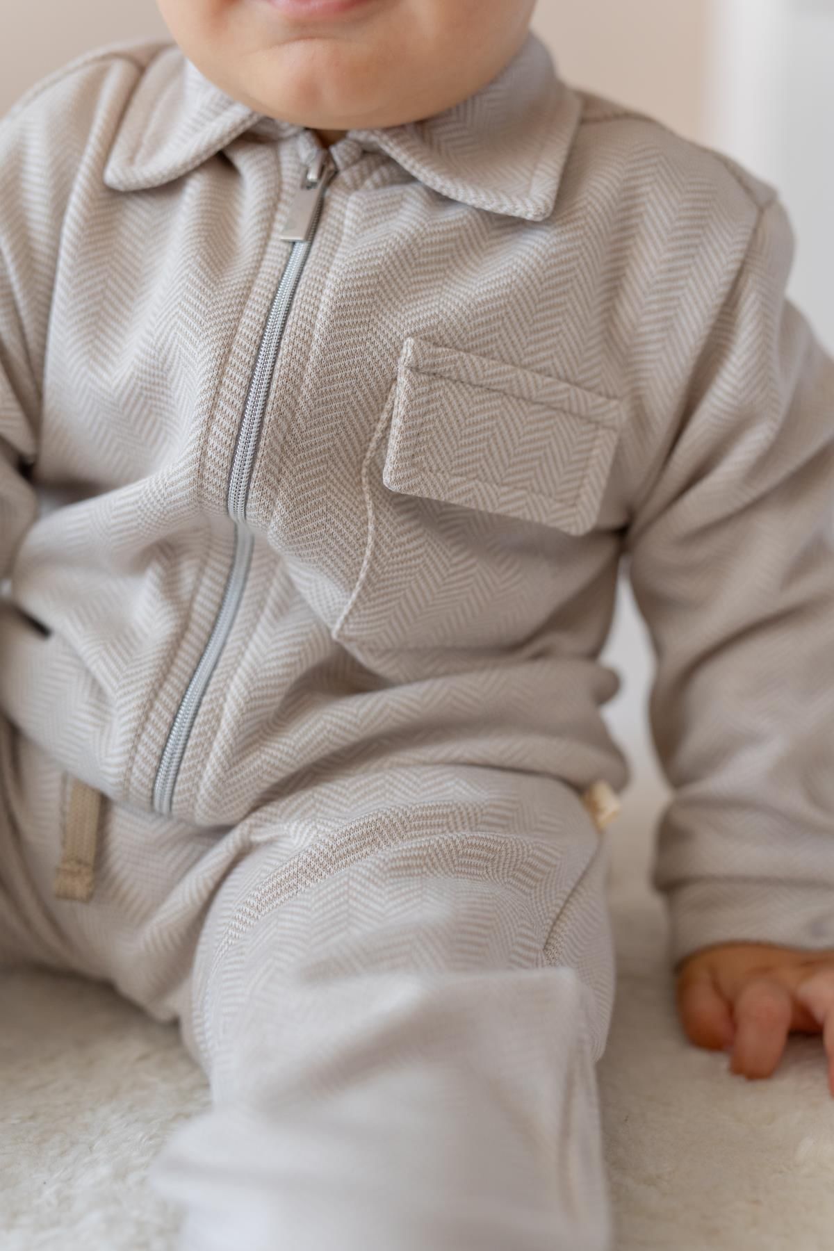 Bej Herringbone Desenli Fermuarlı Ceket, minimalist tasarımıyla hem şıklığı hem de konforu bir araya getiriyor.