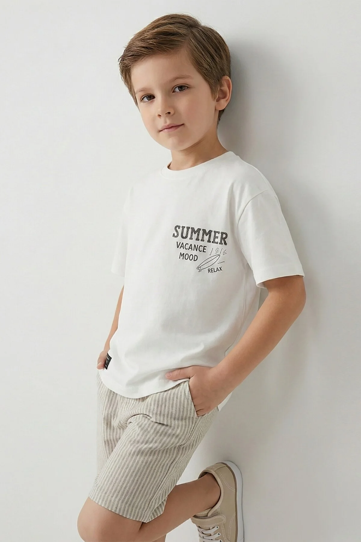 Bisiklet yaka t-shirt ve bağcıklı şort kombinasyonu ile modern bir görünüm sağlar.