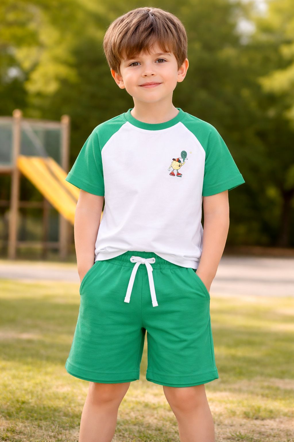 Oversize tişört üzerindeki renkli Tennis Cartoon baskısı ve kontrast detaylar, miniklerin stiline dinamizm katarken, şortun esnek yapısı oyun saatlerinde özgür hareket imkânı sağlıyor.