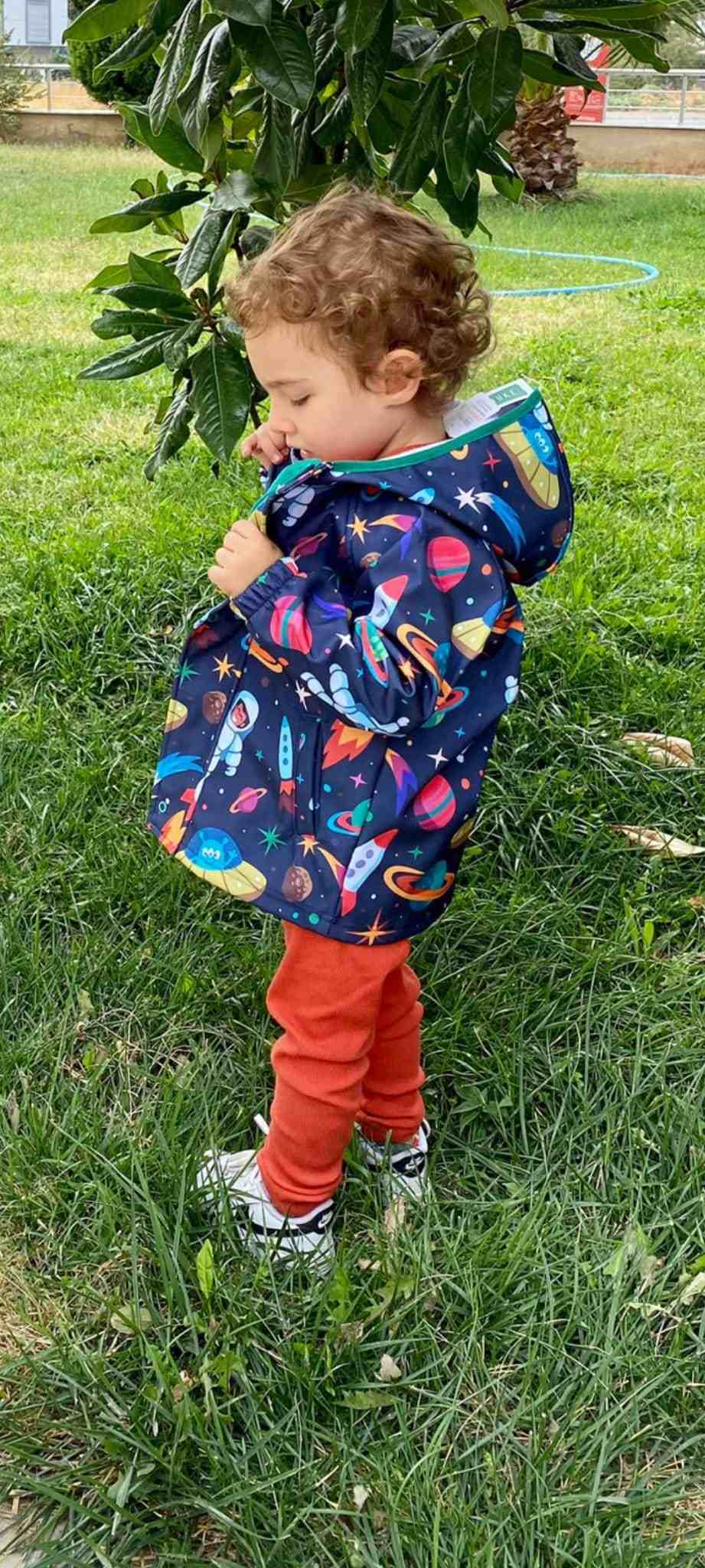 Su itici özellikte,iç kumaşı softshell,dışı uzay baskılı ,kapüşonlu ,fermuarlı ve extra koruyucu özellikte olması için palet kapatmalı ceket.