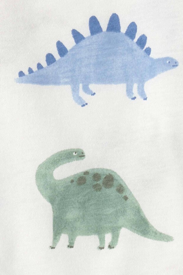 Beyaz tişört hayal gücünü harekete geçiren neşeli bir dinozor baskısına sahipken, yeşil salopet minikler için kullanışlı bir kanguru cebe sahiptir.