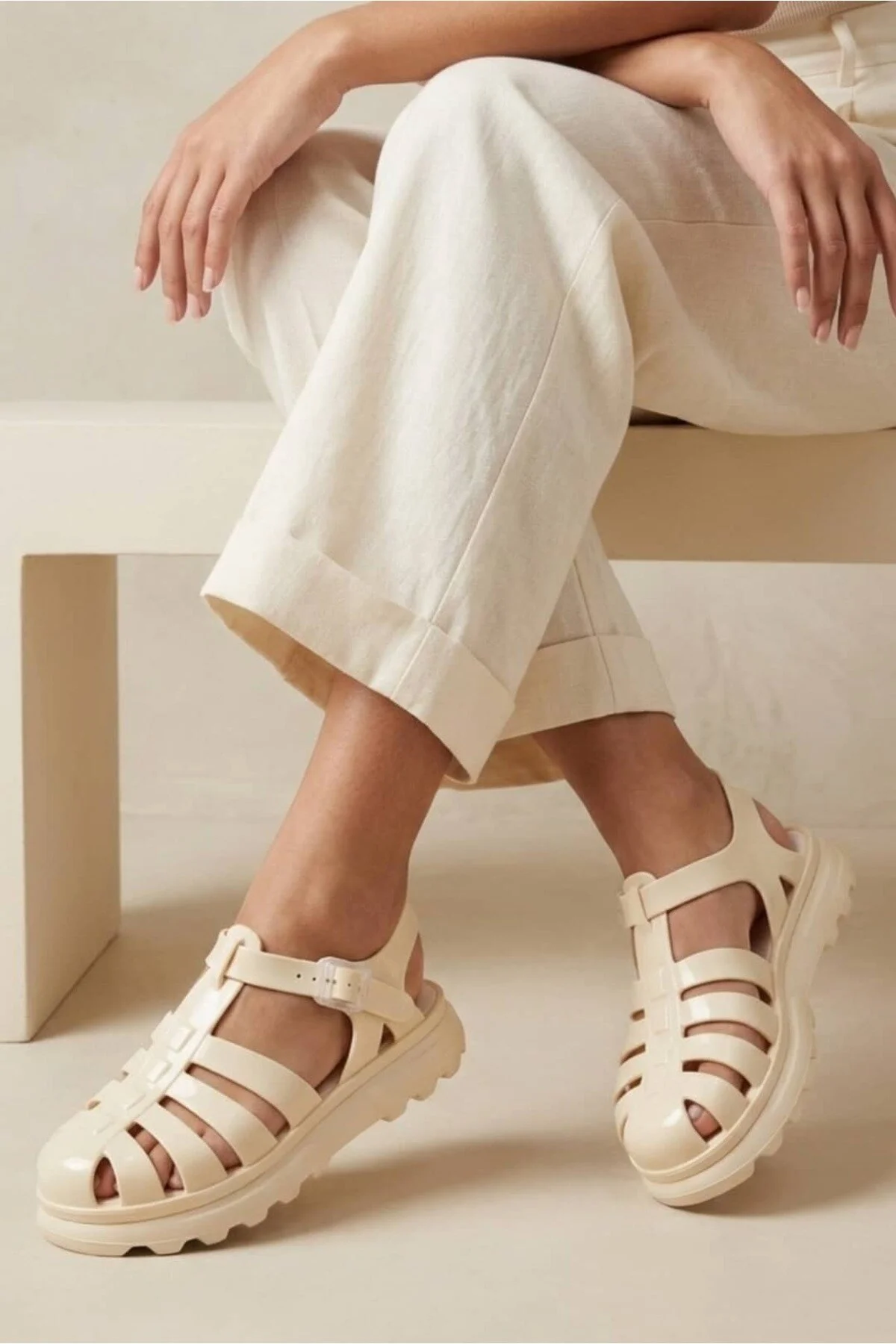 Tasarımın en belirgin özelliği, klasik "jelly shoe" tarzını modern bir silüetle birleştiren kafesli burun yapısı ve yan kısımlardaki estetik pencerelerdir.