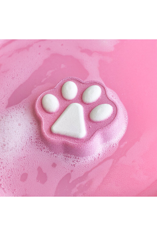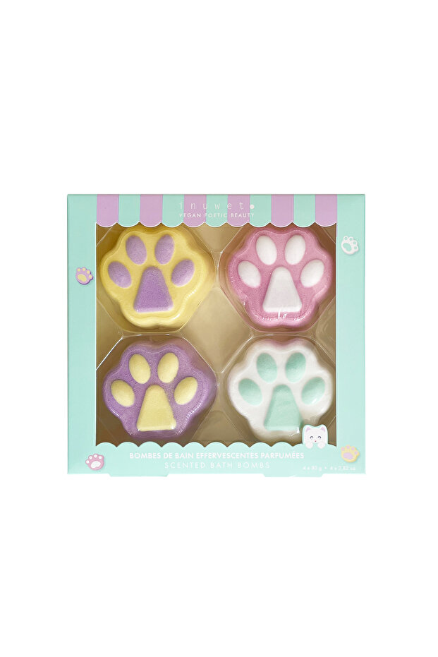 Çok tatlı bir kutu içinde 4 adet kedi pati formunda banyo bombası bulunuyor; üstelik nefis kokularıyla: sakız, çilek, vanilya ve pamuk şekeri.