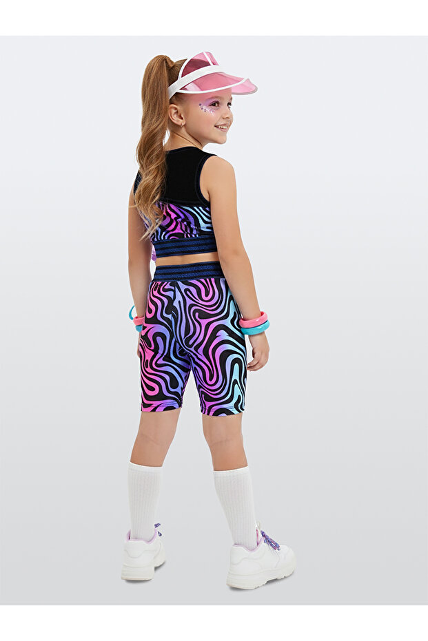 Takımın alt parçası olan dizüstü boy spor tayt, canlı renklerle tasarlanmış zebra desenli baskısı sayesinde dinamik ve eğlenceli bir görünüm sunar.