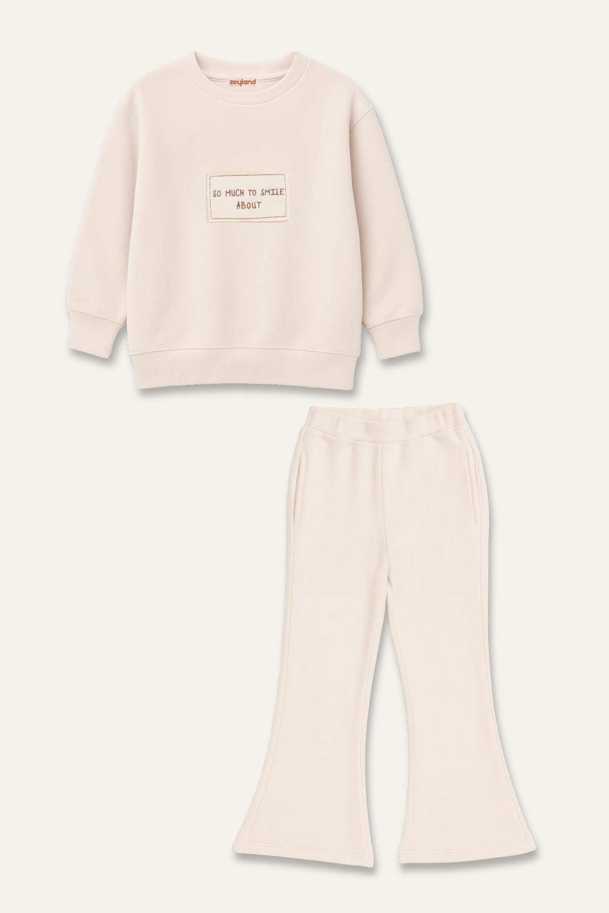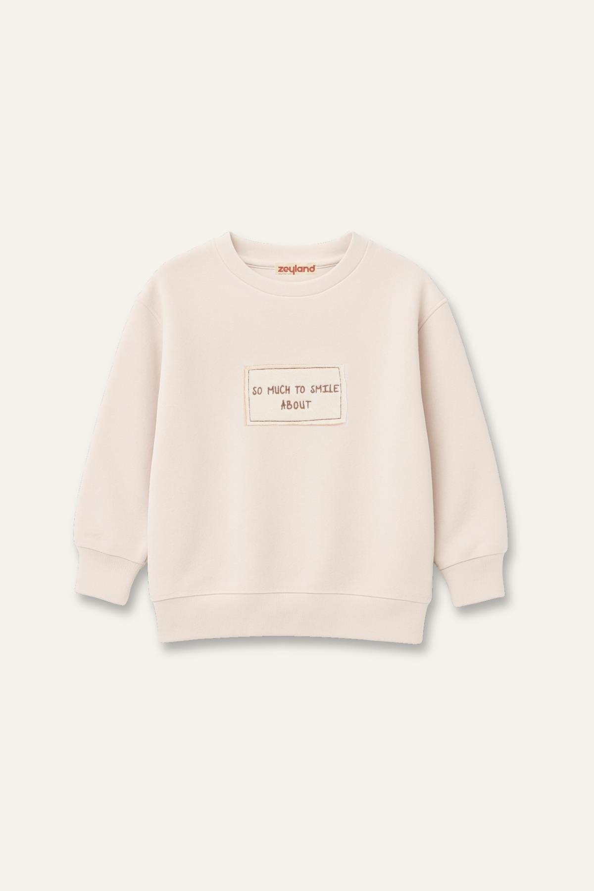 Üst parçası, yuvarlak yaka ve uzun kollu tasarımıyla sade bir duruş sergilerken, ön kısmındaki “So Much To Smile About” yazılı patch detayıyla şirin bir hava kazanıyor.