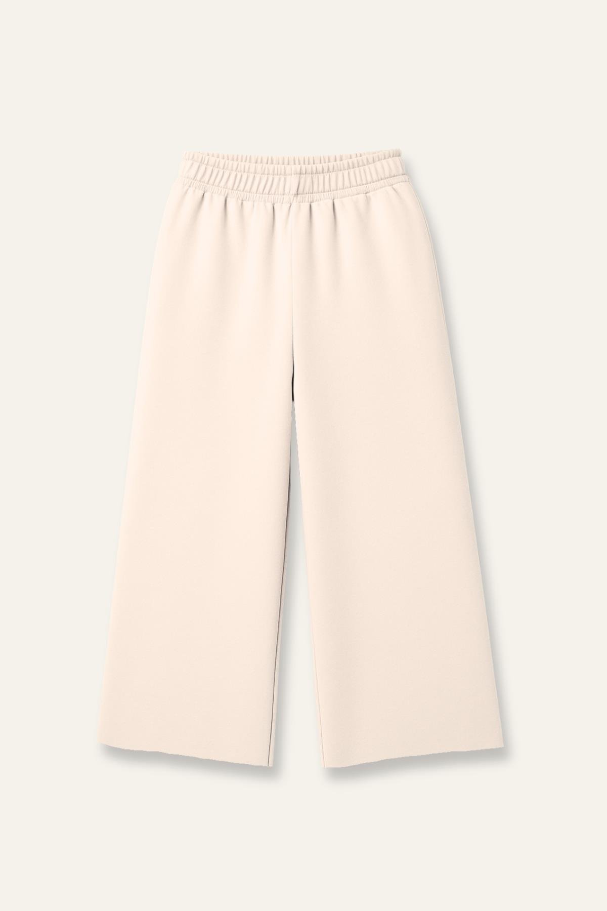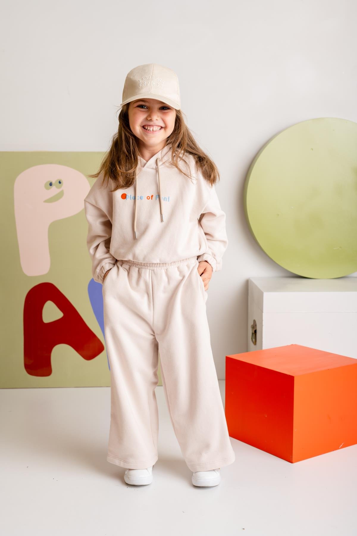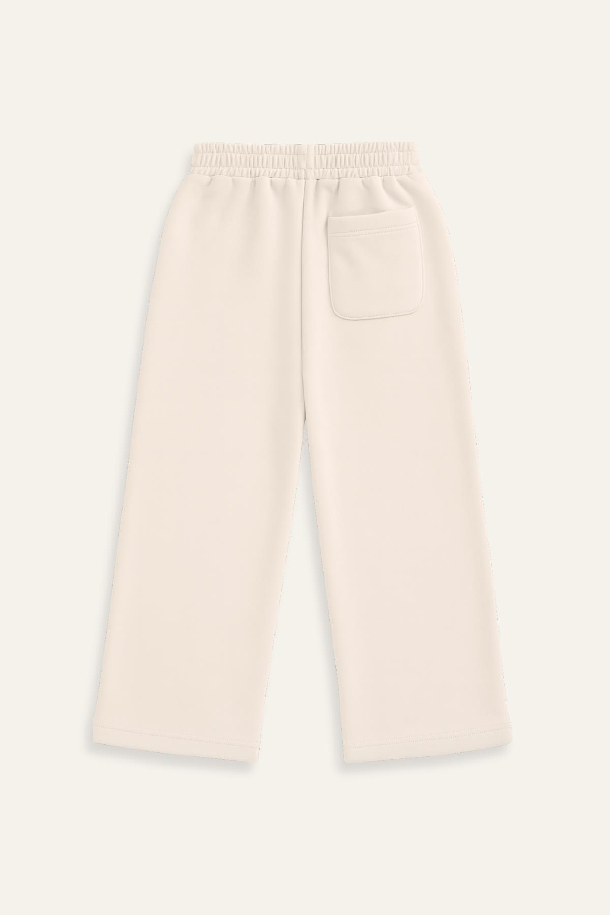 Modern tasarımıyla öne çıkan krem wide leg çocuk pantolon, çocukların gün boyu rahat ederken şık görünmesini sağlıyor.
