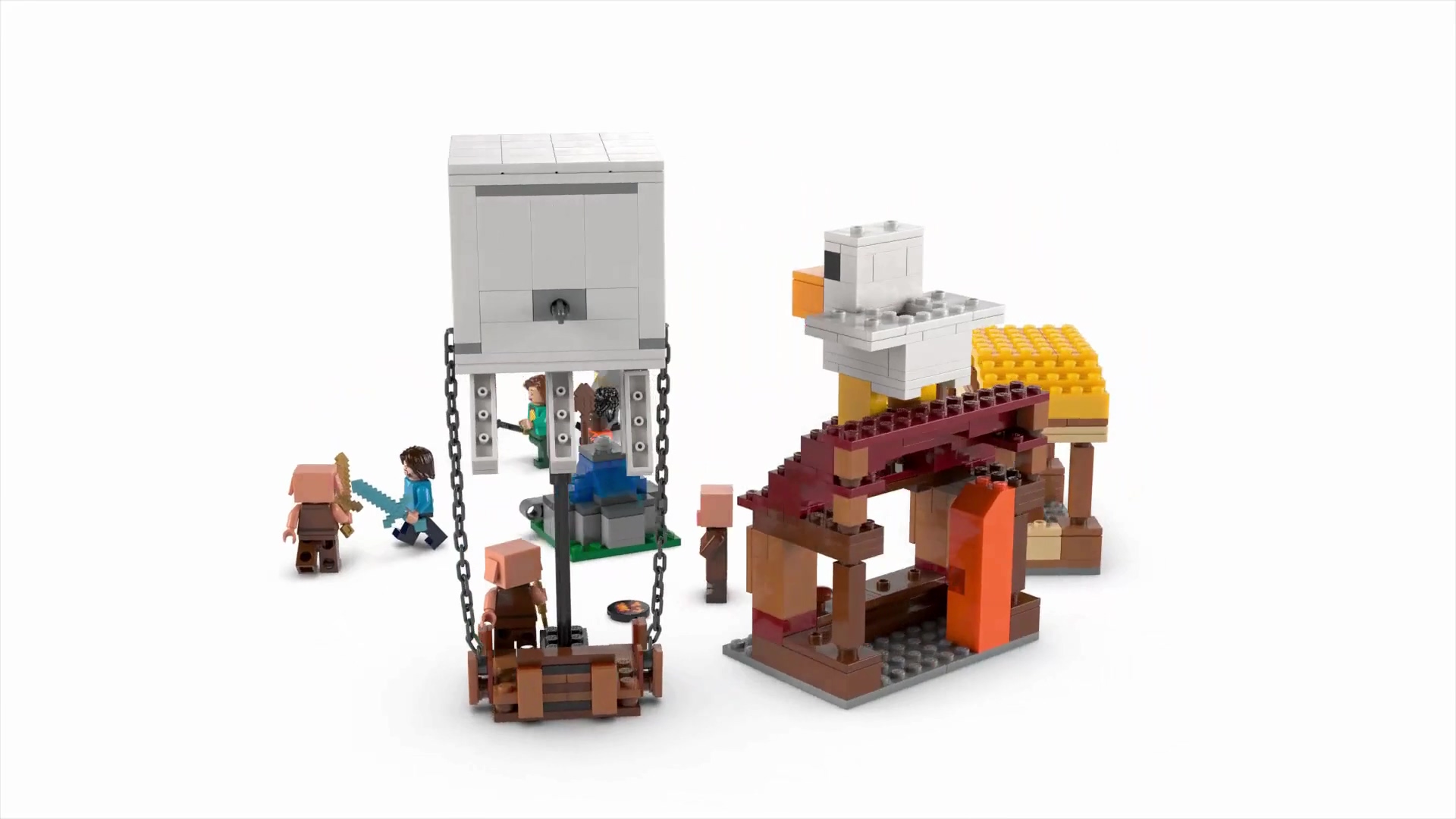 Sette video oyunundan popüler karakterler bulunur: Steve, Natalie, Dawn, 2 piglin, bir hortlak balon, köylü, civciv ve duruşu ayarlanabilir demir golem figürü.