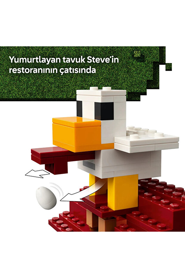 Restoranın çatısında, eğlenceli bir yumurtlama işlevine sahip büyük bir tavuk modeli vardır.