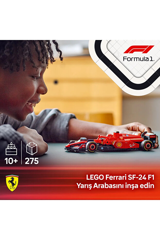 Çocuklar ve yetişkin araba koleksiyoncuları 2024 Formula 1 sezonunda yarışan gerçek arabadan detaylar içeren Ferrari oyuncak aracı inşa edebilir, sergileyebilir ve yarıştırabilir.