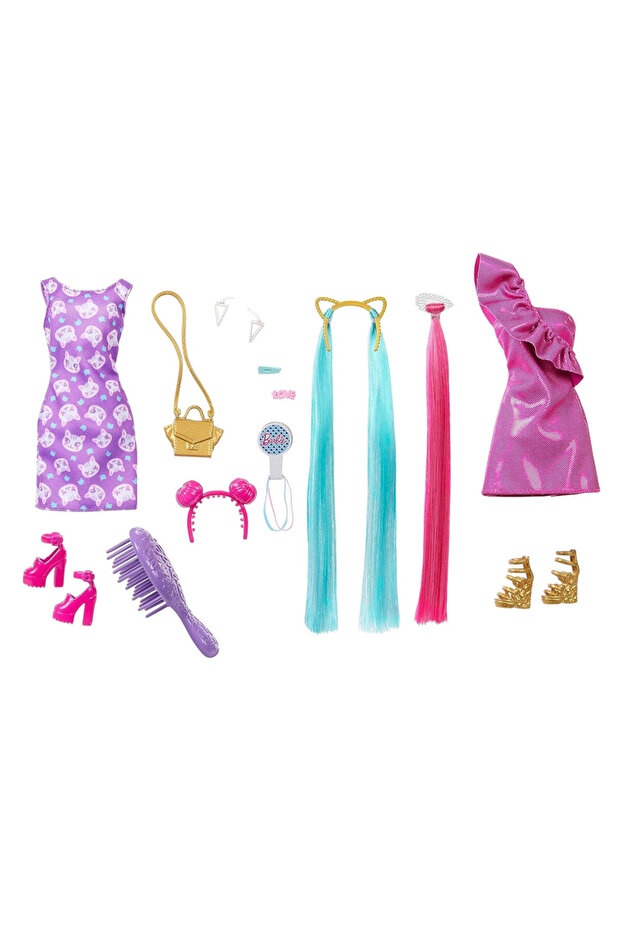 Barbie bebek, 2 adet elbise, 2 çift ayakkabı, fırça ve çeşitli saç stili parçaları bulunmaktadır.