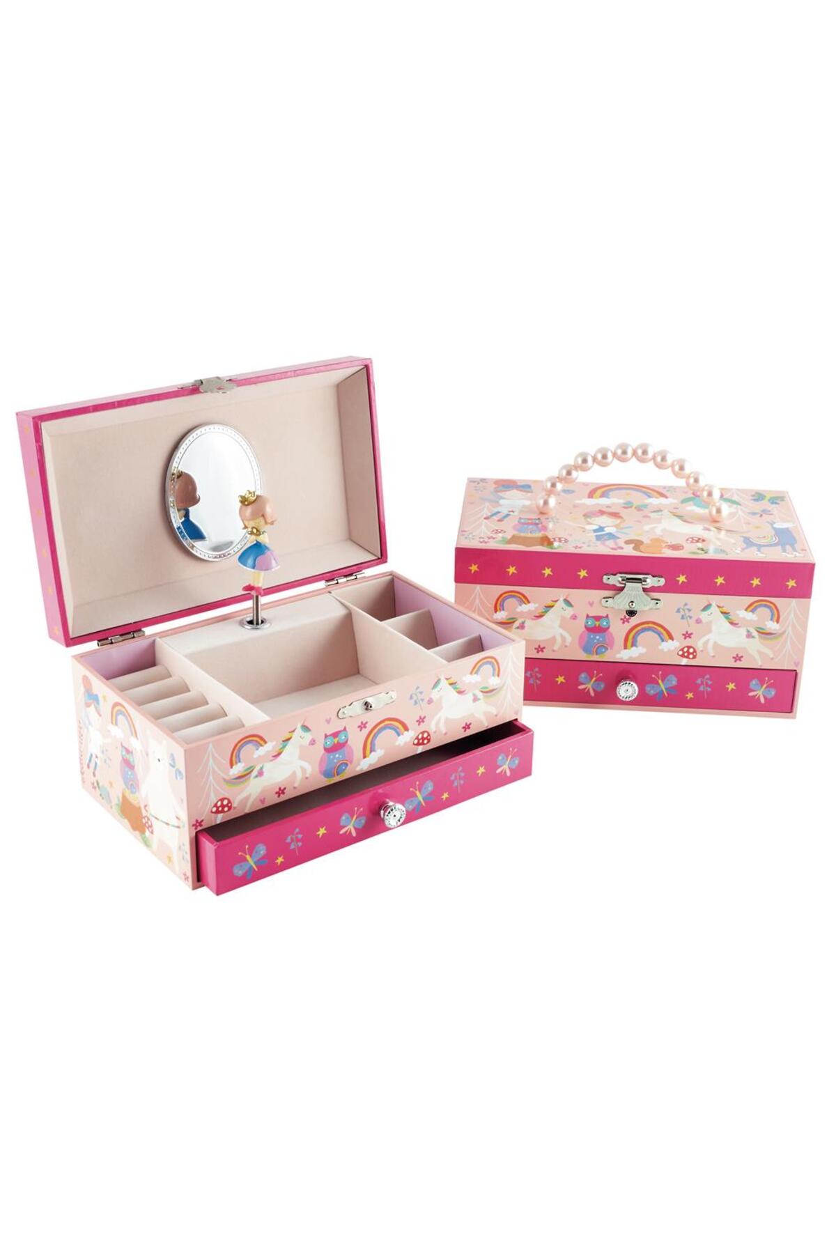 Kutularda, çocukların değerli eşyalarını saklayabilecekleri geniş bir alan, çekmece, bir ayna, incilerle kaplı sapı ve dans eden bir prenses bulunmaktadır.