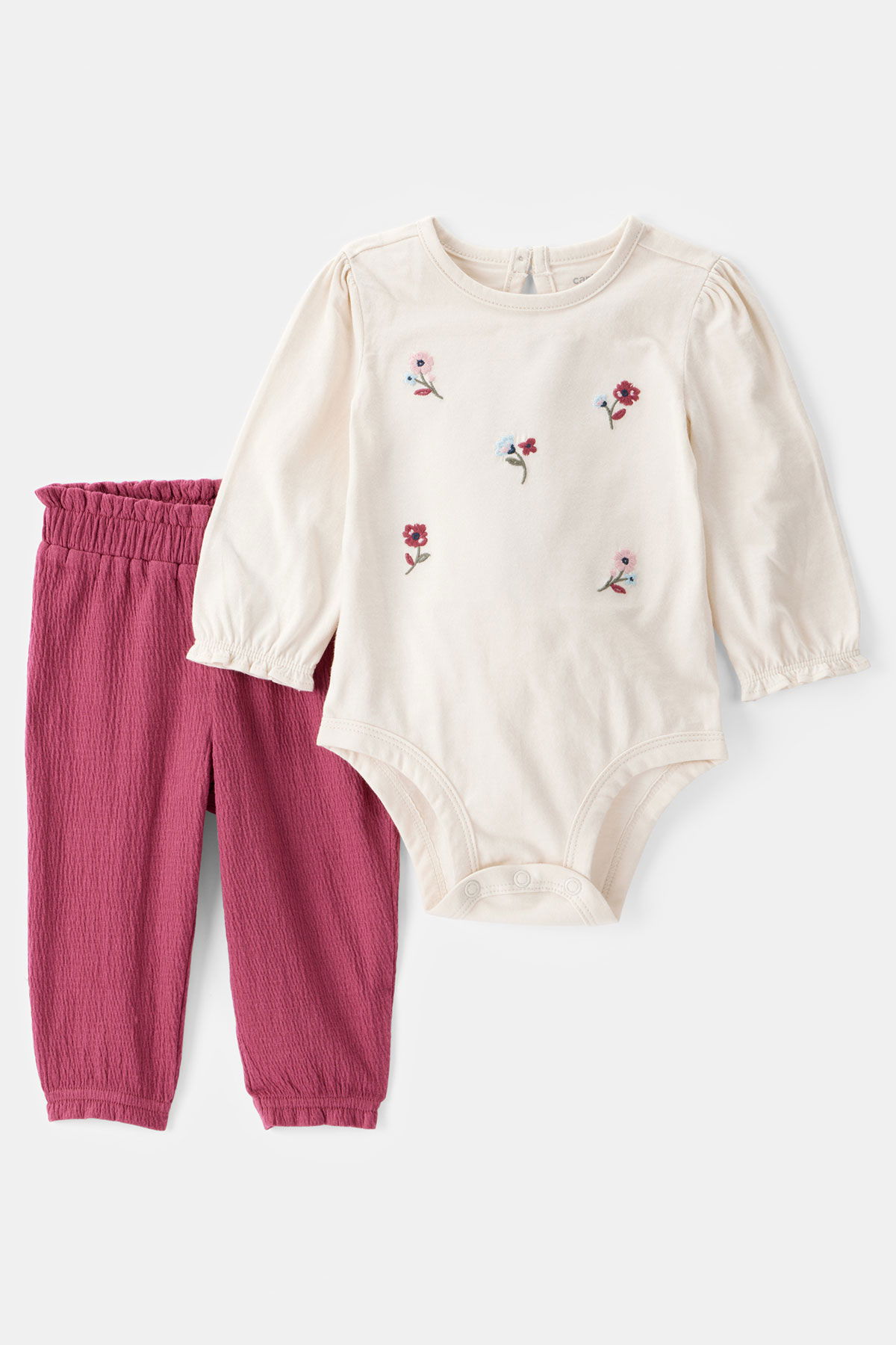 Çiçek Desenli Uzun Kollu Beyaz/Pembe Renkte Tasarlanan 2'li Body ve Pantolon Takımı