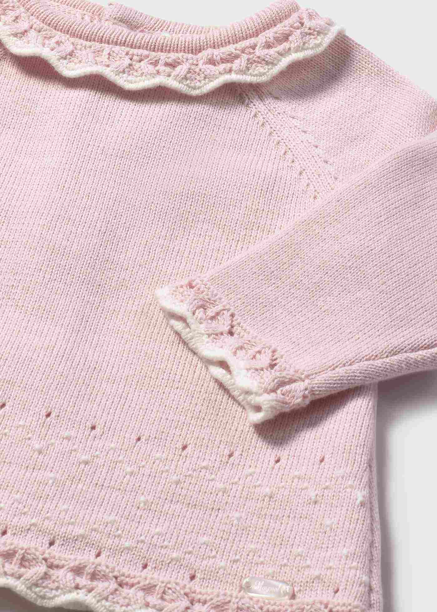 Yenidoğan kız bebek için uzun kollu kazak aynı renk detaylara sahip yuvarlak yakası ve giysinin kolayca giyilip çıkarılmasını sağlayan arka kısımda düğmeler.