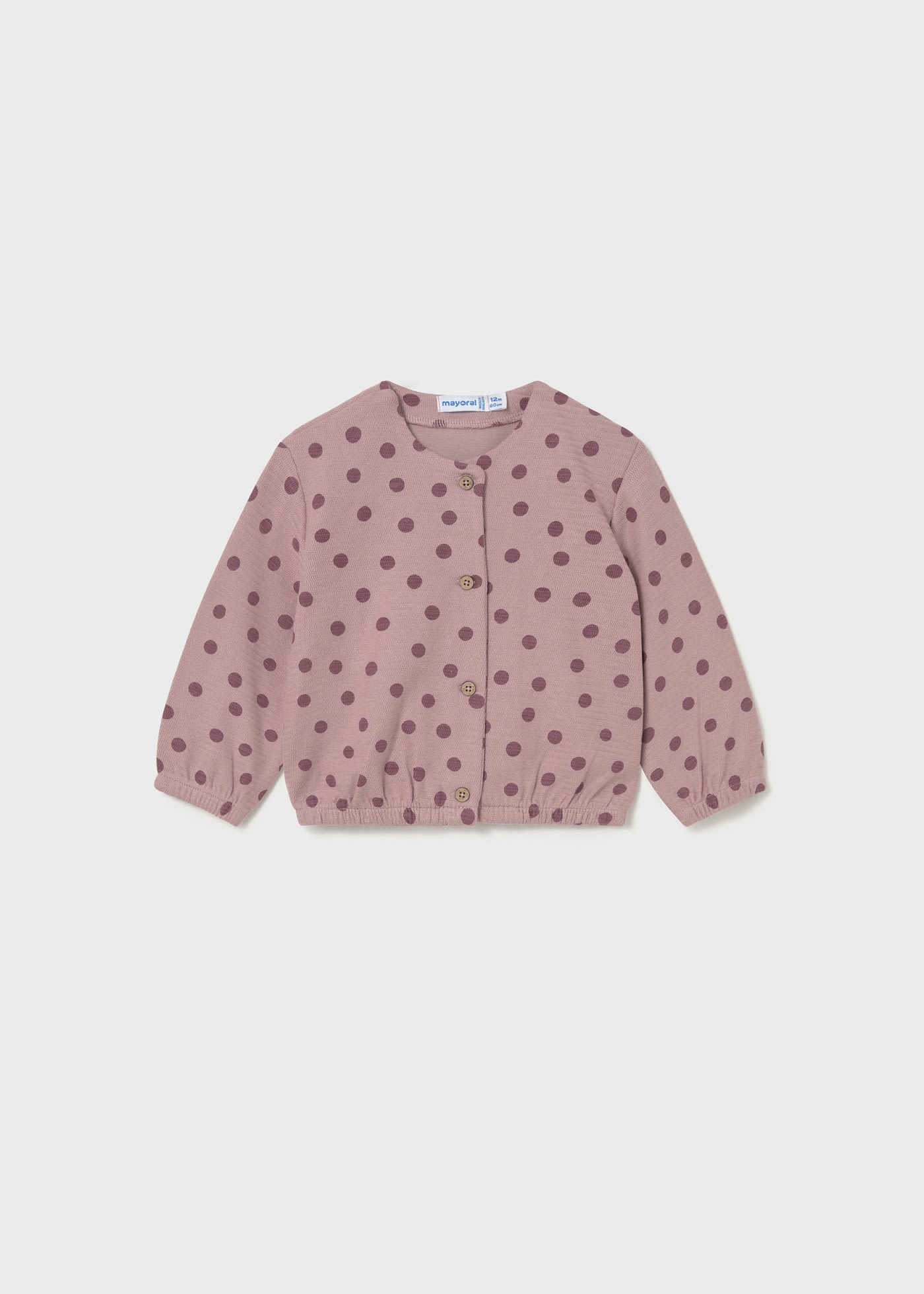 Bebekler için lastikli manşetlere sahip uzun kollu hırka. Yuvarlak yaka. Rahat çizgiler ve düşük omuzlar. Önde düğmeli ilik. Daha iyi bir uyum için lastikli etek ucu.