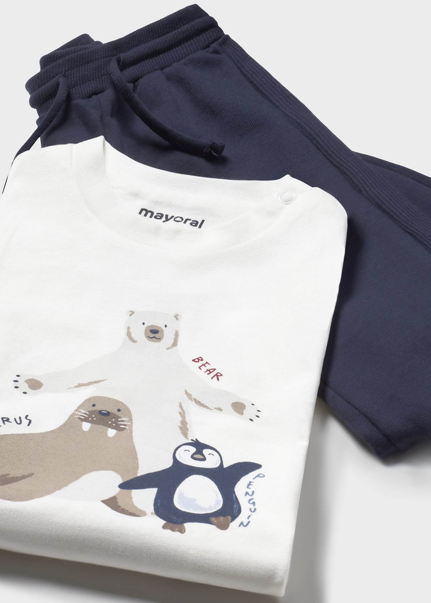 Bebekler için üç parçalı eşofman takımı, sweatshirt, eşofman altı ve uyumlu tişörtten oluşur.