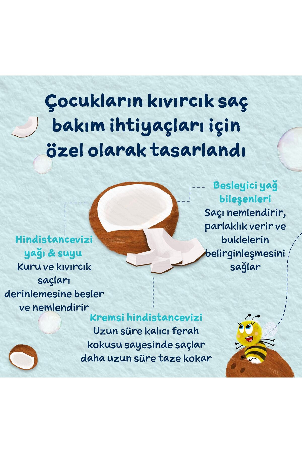 Kuru, kıvırcık ve bukleli çocuk saçları için özel olarak hazırlanmış “durulanmayan” bakım spreyidir.