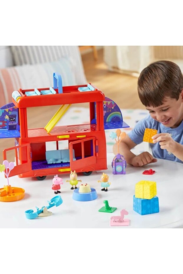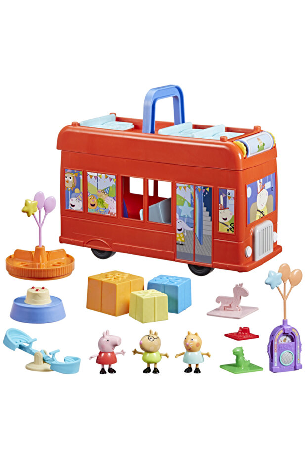 Peppa ve arkadaşlarının neşeli kırmızı çift katlı otobüsle çatıda gezintiye çıktıklarını, ardından üç katlı özelliklerle dolu eğlenceyi keşfetmek için otobüsü parti oyun seti moduna soktuklarını hayal edin.