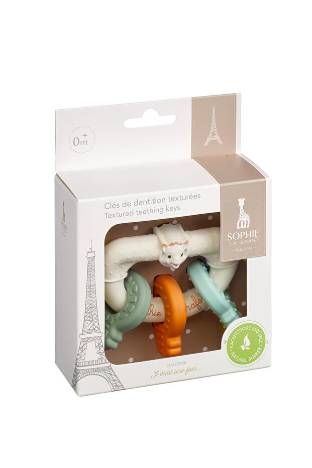 Doğal kauçuktan üretilmiş diş çıkarma oyuncağı – üç adet anahtar şekilli aksesuar içerir .