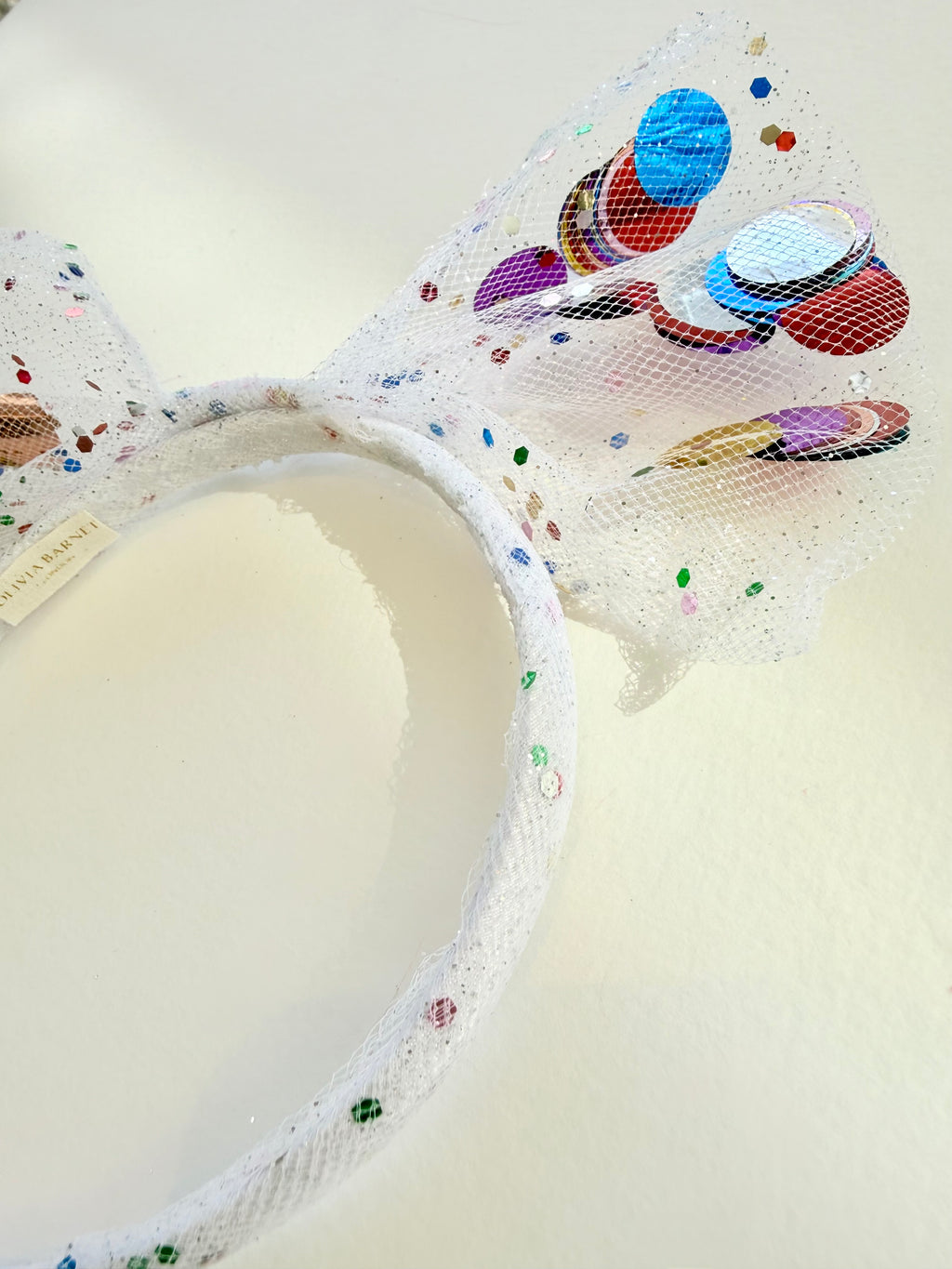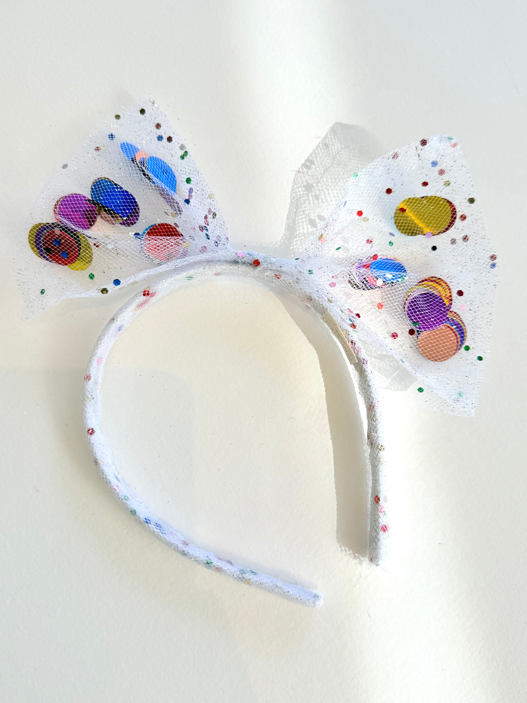 Hareketli ve renkli payetlerle tasarlanan Party Pop Bow Taç, çocukların enerjisini yansıtan eğlenceli ve ışıltılı bir saç aksesuarıdır.