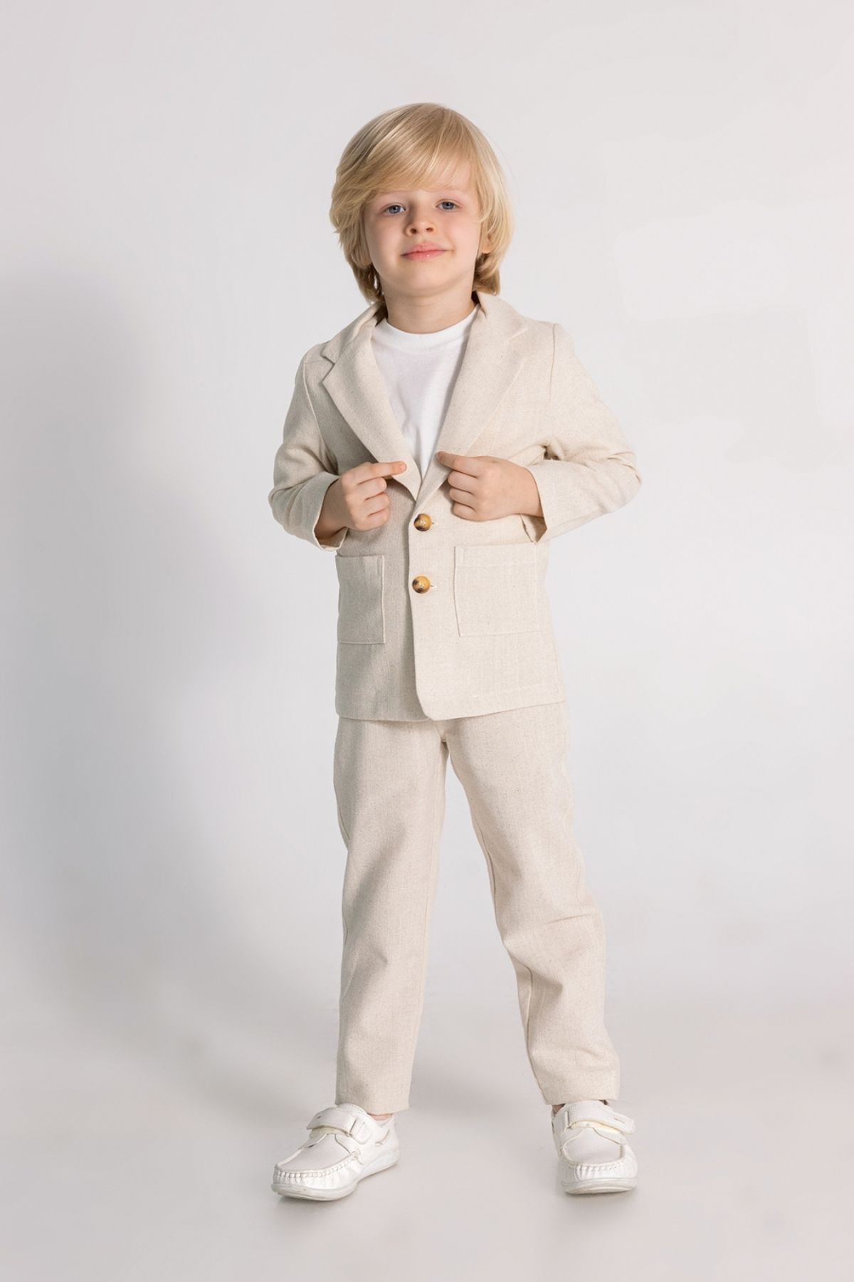 Bej rengiyle şık ve zamansız bir görünüm sunan çocuk takım elbise, genç beylerin tarzını yansıtır.