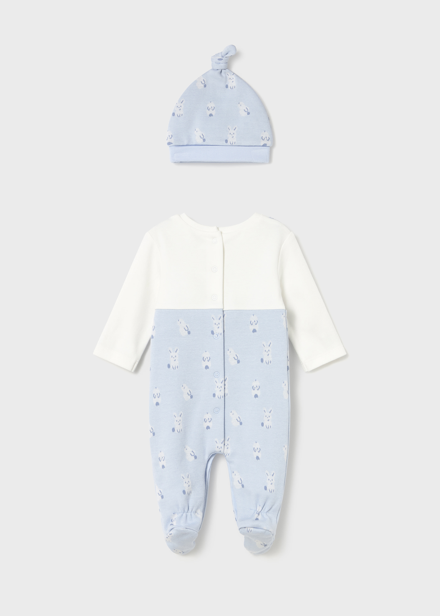 Yenidoğan erkek bebek için uzun kollu tek parça. Yuvarlak yaka bady çıkarılamayan tulumla tasarlanmıştır.