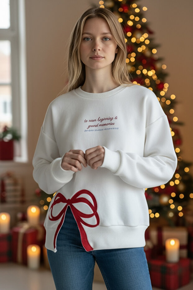 % 100 Pamuk 3 iplik şardonsuz kumaş sweatshırtte yırtmaçlı nakış detayı , arkada el çizimi özel tasarım baskıdır.